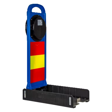 Stabiler Edelstahlfuß mit Kunststoffstapelschienen. Durch den neuen Fuß ist eine sichere Stapelbarkeit bei mehreren FlashMax Leuchten übereinander gewährleistet. Zusätliche Anti-Rutsch-Noppen bieten einen sicheren Stand auf glatten Flächen und erhöhen nochmals die Standsicherheit bei vorbei fahrenden Fahrzeugen.