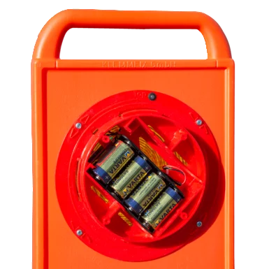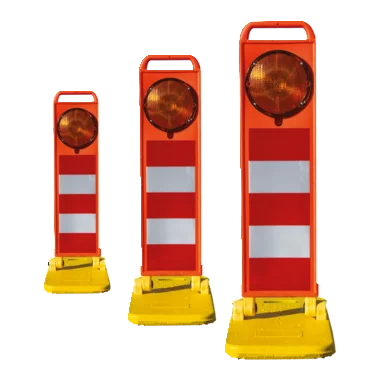 Bei einer Betriebsdauer von bis zu 160 Stunden wird eine hohe Warnwirkung durch vier Hochleistungs-LEDs erzielt, mit einer Lichtstärke entsprechend EN12352, Klasse L8M/L8L (WL4). Bakenblatt und Fußplatte sind mit zwei robusten Kippgelenken verbunden.