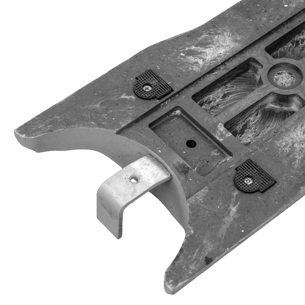 Das abgeschrägte Endstück A für Leitschwellen, erhältlich in gelb oder weiß, hat einen Kupplungshaken. Es ist wie die Leitschwelle selbst aus Recyclingmaterial und mit dem Anti-Rutsch System ARS ausgestattet