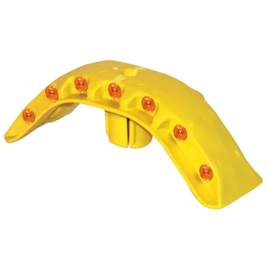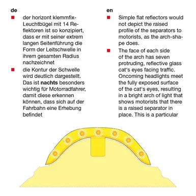 Durch Leuchtbügel auf jedem Leitschwellen-Element, kann noch mehr Sicherheit gewährleistet werden. Der Leuchtbügel, erhältlich in gelb oder weiß, mit 14 Reflektoren ist so konzipiert, dass er mit seiner extrem langen Seitenführung die Form der Leitschwelle in ihrem gesamten Verlauf nachzeichnet.