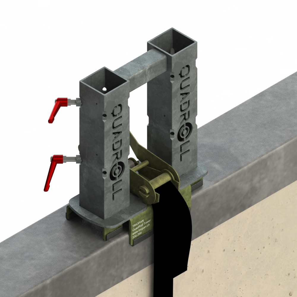 Der QuadRoll TOWER ist direkt und ohne Werkzeug an allen gängigen Leitsystemen, welche eine Montage mit Spanngurt